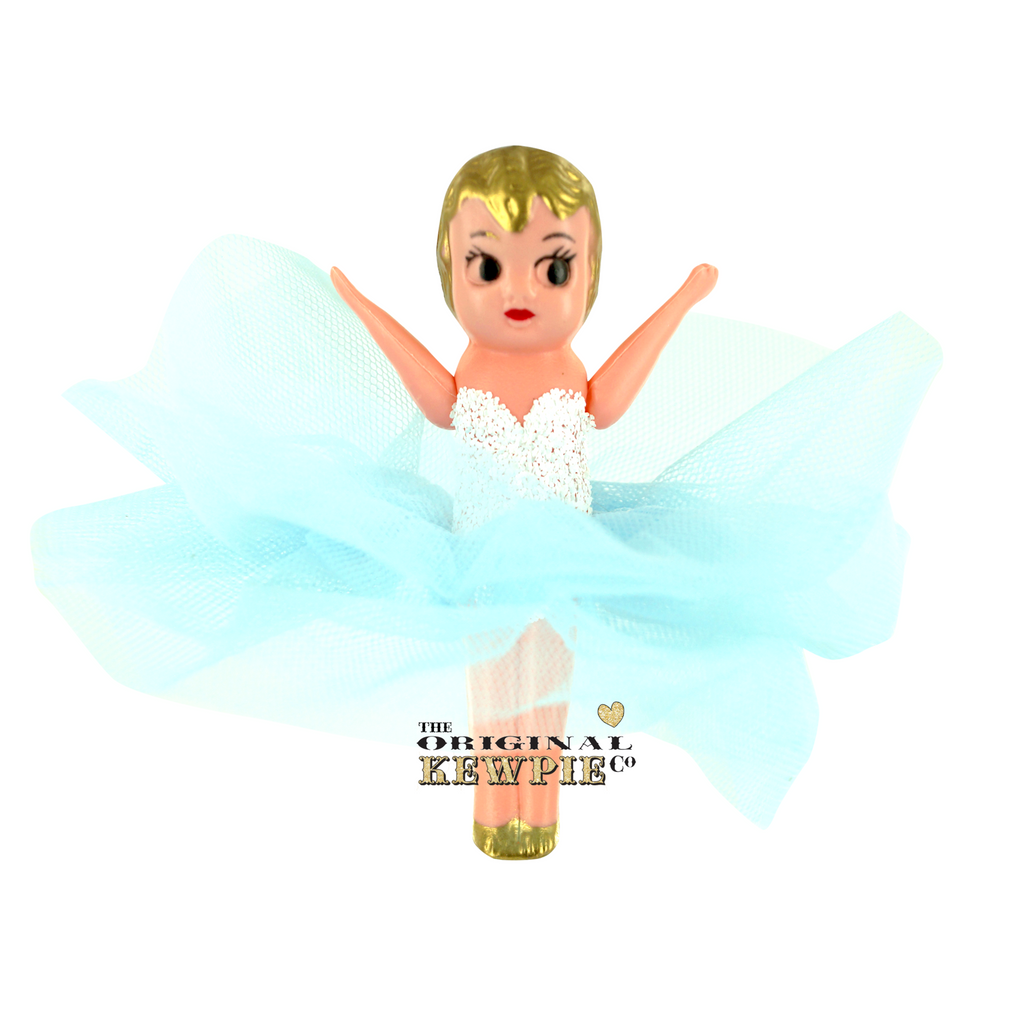 This dressed Original Kewpie Co Kewpie Doll comes with a White glittered bodice and an Original Kewpie Co Kewpie Doll Baby Blue plain tulle tutu skirt.