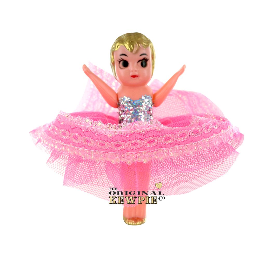 This dressed Original Kewpie Co Kewpie Doll comes with a silver glittered bodice and an Original Kewpie Co Kewpie Doll pink tulle tutu skirt with pink lace trim.