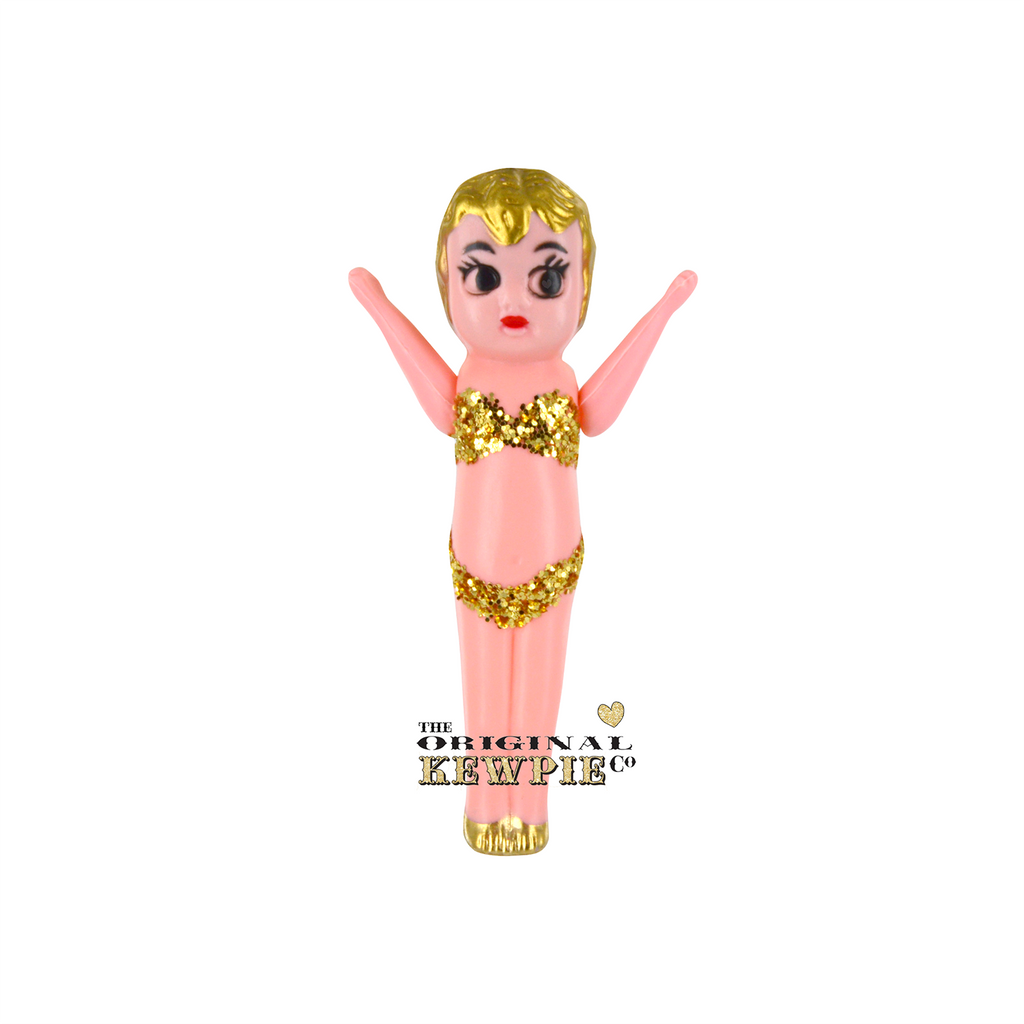 This Bikini Kewpie comes with a hand painted Bikini top & bottom (Front and Back) in gold glitter.