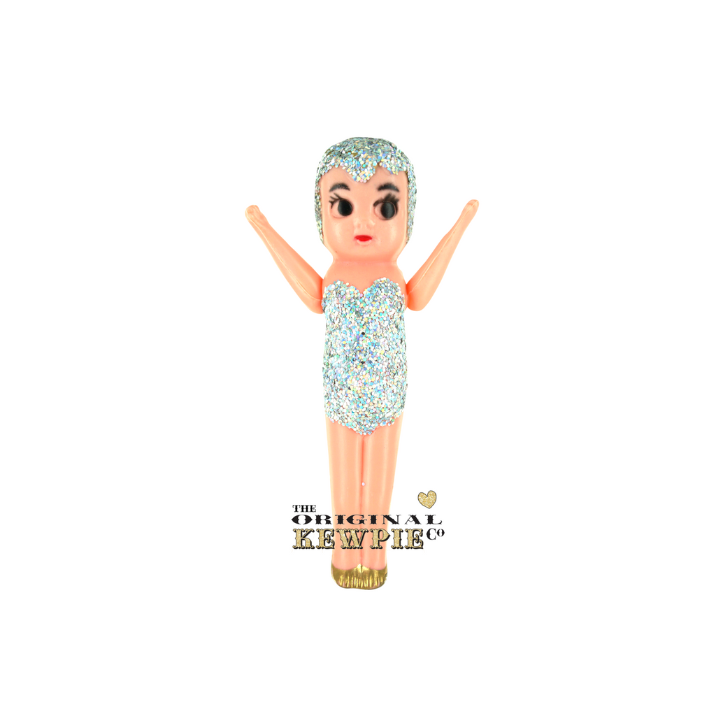 This Plain Kewpie comes with a hand painted full Glam Glittered head and sweetheart bodice in silver glitter.