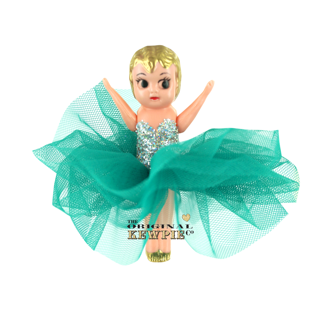 This dressed Original Kewpie Co Kewpie Doll comes with a hand painted Silver glittered bodice and an Original Kewpie Co Kewpie Doll Hunter Green plain tulle tutu skirt.