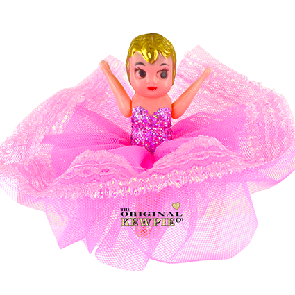 This dressed Original Kewpie Co Kewpie Doll comes with a pink glittered bodice and an Original Kewpie Co Kewpie Doll pink tulle tutu skirt with pink lace trim.