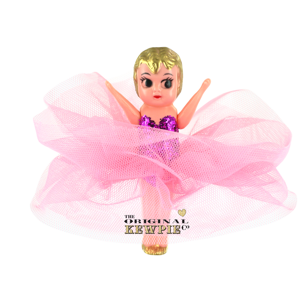 This dressed Original Kewpie Co Kewpie Doll comes with a Hot Pink glittered bodice and an Original Kewpie Co Kewpie Doll Pink plain tulle tutu skirt.