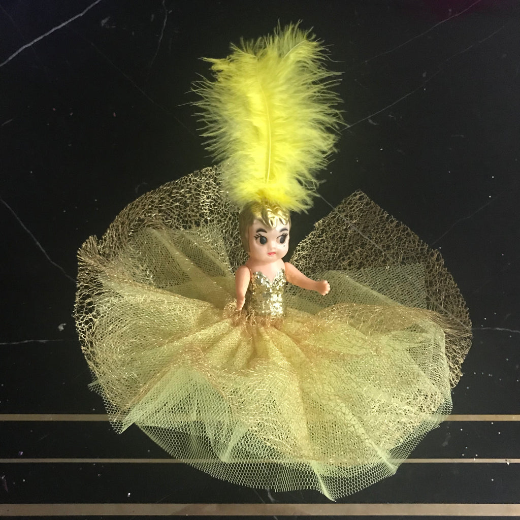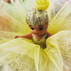 Angelle, the Kewpie Show Girl, is dressed in a one of a kind design by The Original Kewpie Co. Hand painted Gold Glitter Bodice in a sweetheart neckline, Yellow plain Tulle Tutu skirt with gold overlay and a gorgeous Yellow feather headdress. An Australian Original Kewpie Creation from 1949.