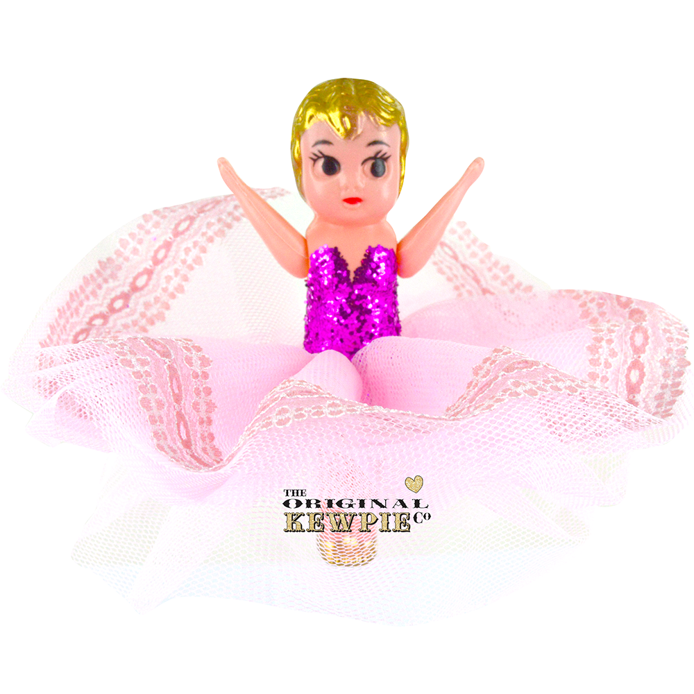 This dressed Original Kewpie Co Kewpie Doll comes with a Hot Pink glittered bodice and an Original Kewpie Co Kewpie Doll Baby pink tulle tutu skirt with pink lace trim.