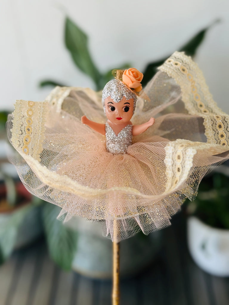 This is Marge, she is dressed in a one of a kind design by The Original Kewpie Co. Hand painted White glitter bodice with a sweetheart neckline and Apricot Tulle Tutu with Lace trim. An Australian Original Kewpie Creation from 1951.