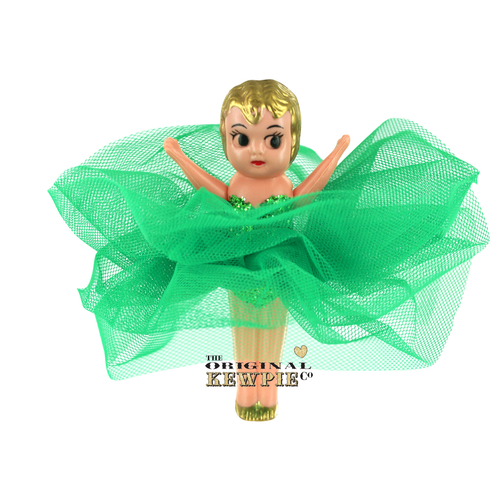 This dressed Original Kewpie Co Kewpie Doll comes with a hand painted Green glittered bodice and an Original Kewpie Co Kewpie Doll Green plain tulle tutu skirt.