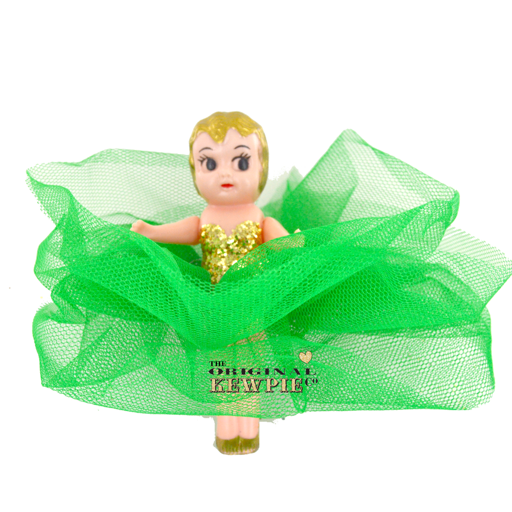 This dressed Original Kewpie Co Kewpie Doll comes with a hand painted gold glittered bodice and an Original Kewpie Co Kewpie Doll Emerald Green plain tulle tutu skirt.