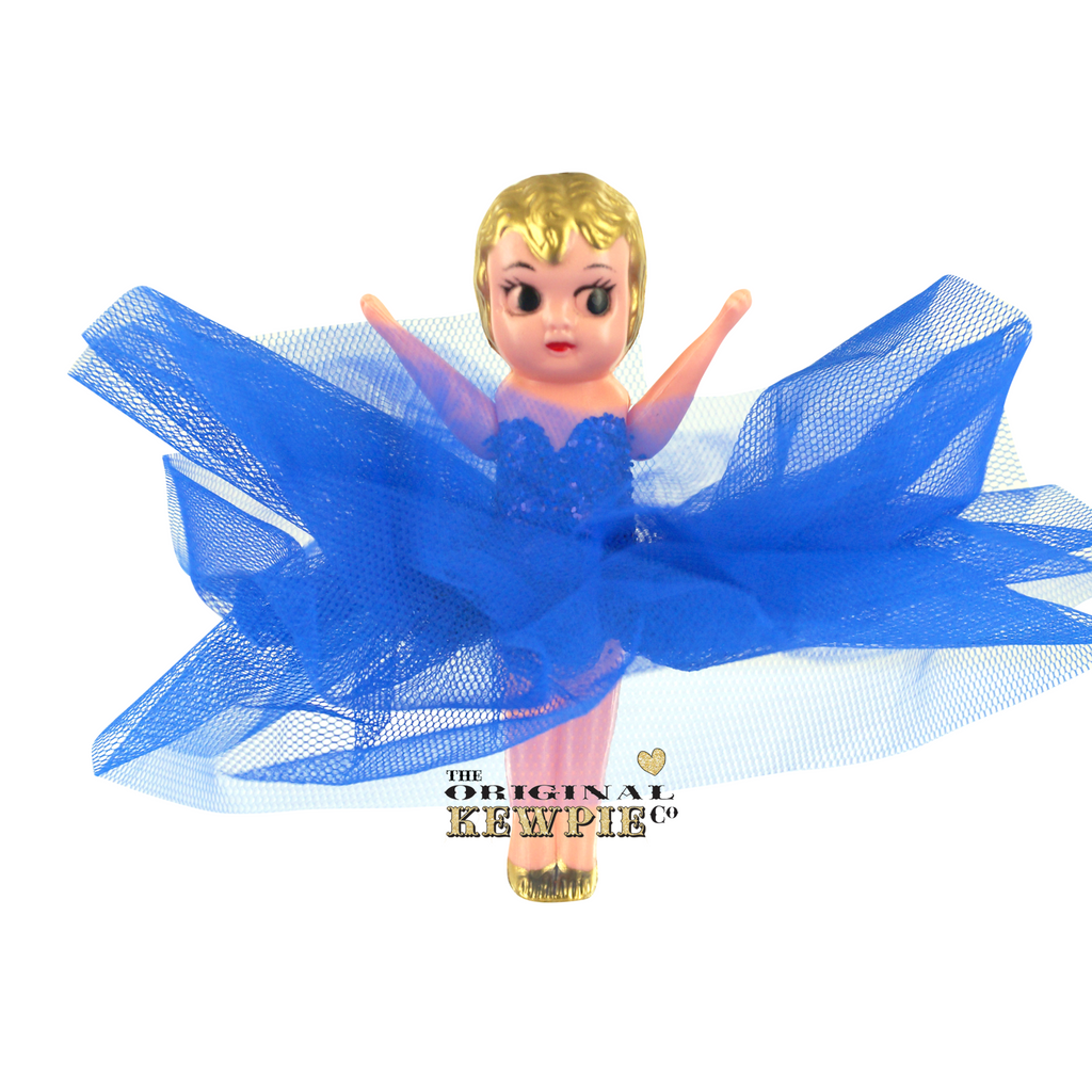 This dressed Original Kewpie Co Kewpie Doll comes with a royal blue glittered bodice and an Original Kewpie Co Kewpie Doll royal blue plain tulle tutu skirt.