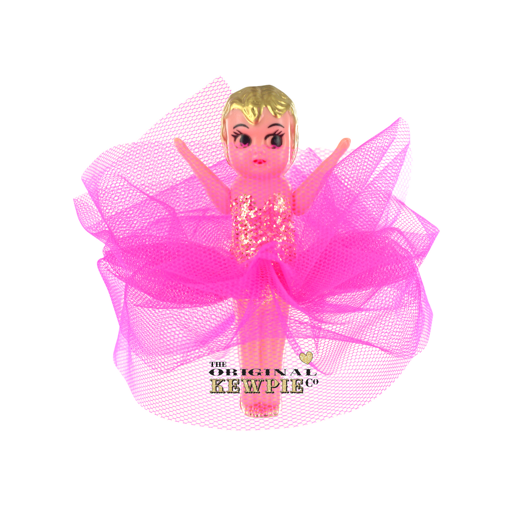 This dressed Original Kewpie Co Kewpie Doll comes with a gold glittered bodice and an Original Kewpie Co Kewpie Doll fluro pink plain tulle tutu skirt.