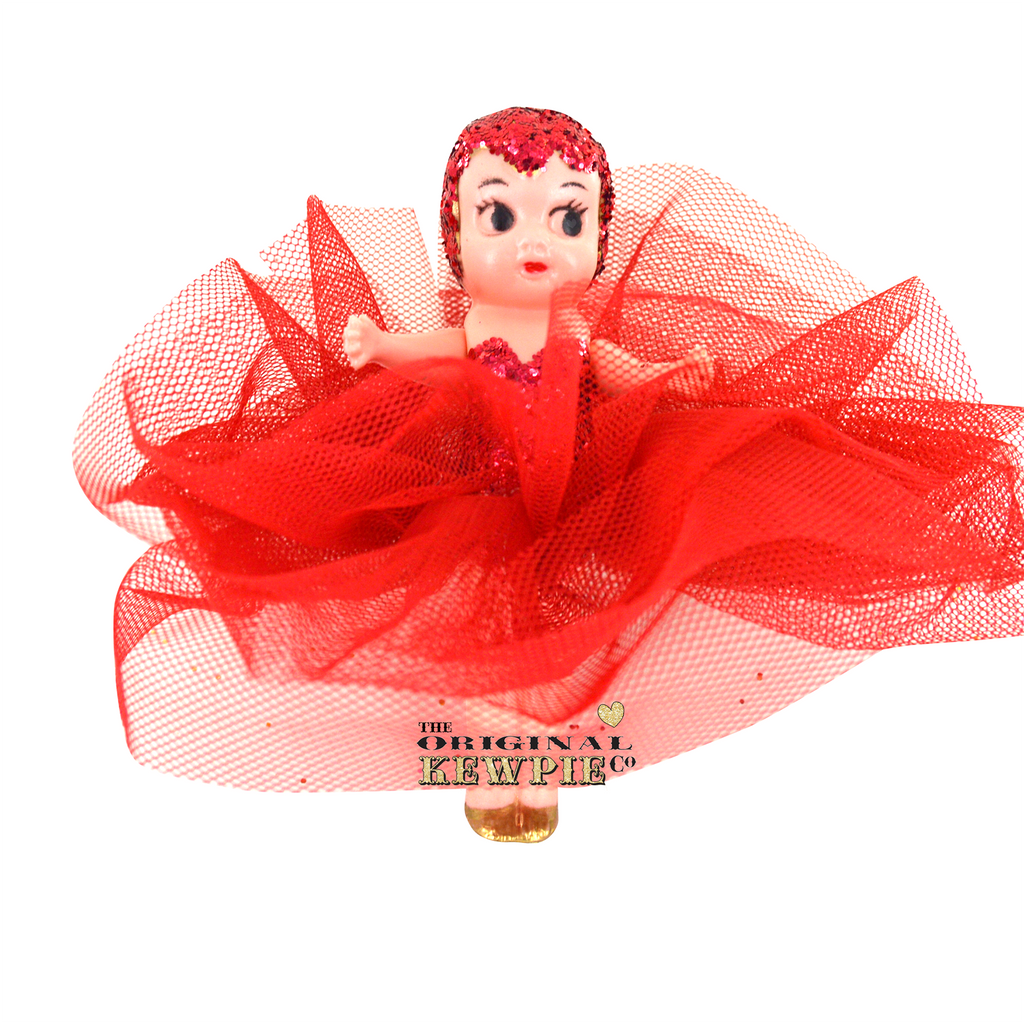 This dressed Original Kewpie Co Kewpie Doll comes with a red glittered bodice and an Original Kewpie Co red tulle tutu skirt.