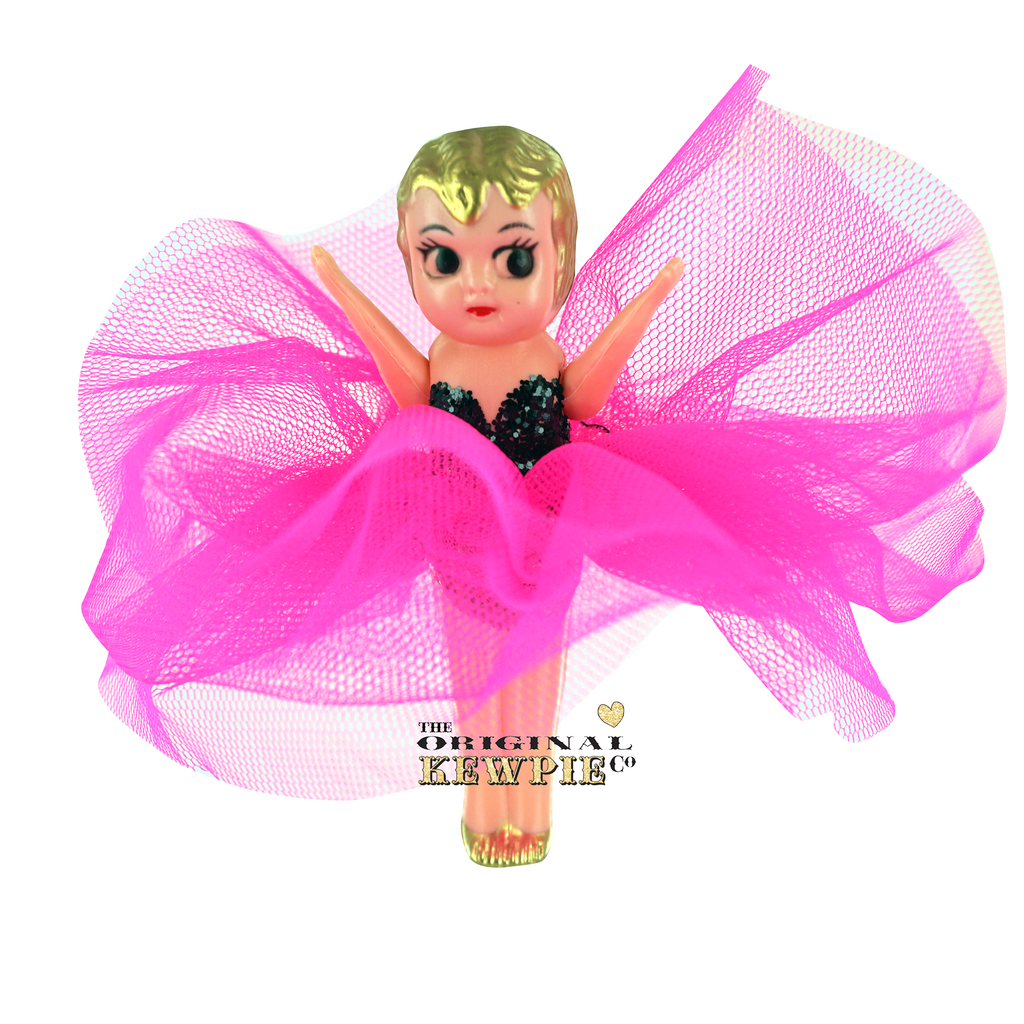 This dressed Original Kewpie Co Kewpie Doll comes with a Black glittered bodice and an Original Kewpie Co Kewpie Doll Fluro Pink plain tulle tutu skirt.